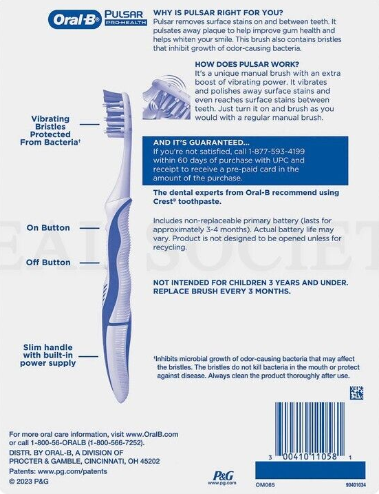 Oral-B Pulsar removes surface stains on and between teeth. It pulsates away plaque to help improve gum health and helps whiten your smile. This brush also contains bristles that inhibit growth of odor causing bacteria.